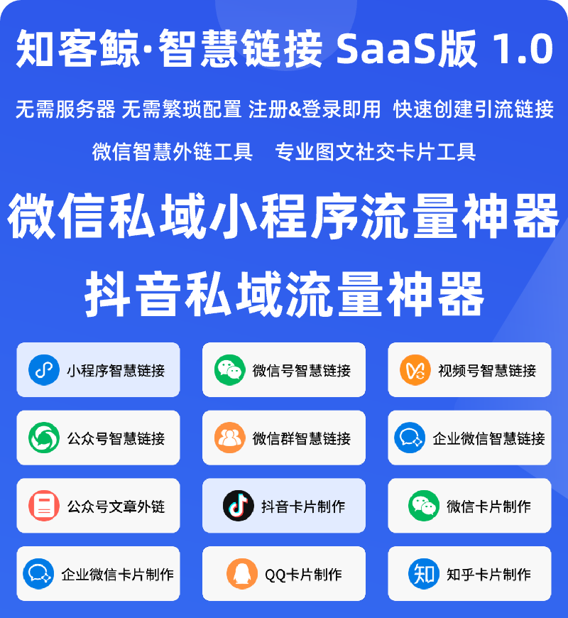 知客鲸·智慧链接是一款全域一键跳转入微信的全域引流工具,支持抖音、知乎、快手等各大公域流量APP点击链接或卡片一键跳转至微信小程序指定页面或指定二维码。致力于让运营大佬们更方便的将公域流量及粉丝高效且快速的引流至微信私域流量池。