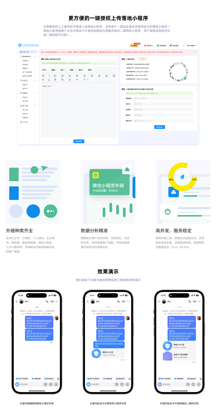 对于商城运营人员或商家来说,抖音、快手、知乎等微信外公域流量非常重要,因为它代表了潜在的用户和潜在的市场机会。比如通过吸引更多的抖音用户关注自己的账号或观看自己的视频,可以增加曝光度、提高知名度,并有可能转化为实际的用户行为,如私域流入、参与活动、购买产品、分销商邀约等。但传统方式很难将这些流量合理高效且快速的引流到微信里,使用【知客鲸·智慧外链】中的外链/卡片等功能可以高效的将流量引入到微信从而进行二次营销。