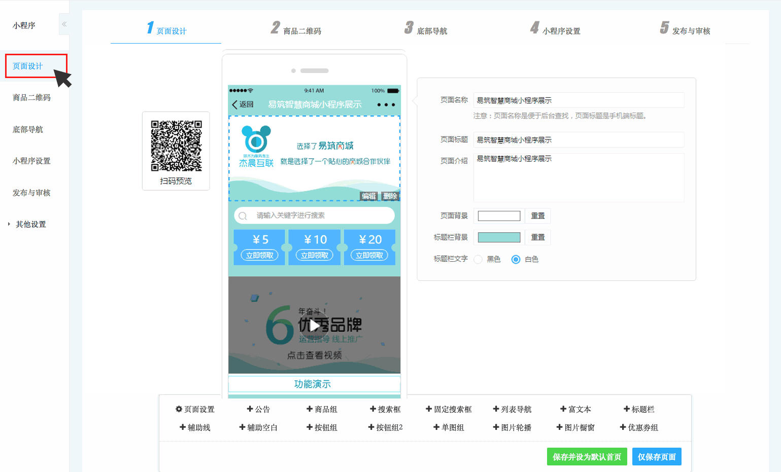 小程序拥有独立装修页面,15种装修组件任你选择,30秒快速掌握装修技巧,实时同步手机商城页面,无需提交微信审核!