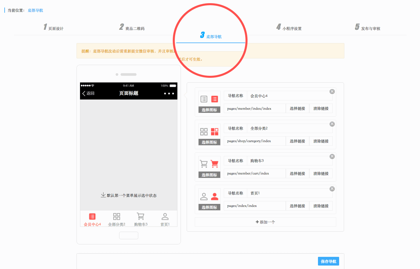 *温馨提示:修改底部导航链接、底部导航图标需重新审核您的小程序!
