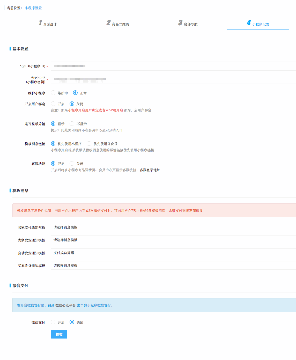 您可在小程序开发基本设置中进行小程序基本设置、模板消息设置和微信支付设置等操作,如果您选择开启模版消息并开启了微信支付,那么您即可向使用微信支付购买商品的用户推送模板消息,操作流程明确,易使用。