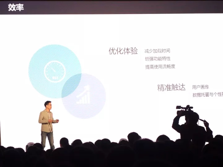 首先,在效率方面将继续优化小程序本身的架构体验。通过代码分裂和下载的方式,去实现“分包下载”,并且用户可以加快使用小程序。提供更智能的功能和服务,使小程序更强大,通过技术框架升级,使小程序实现与APP相同的体验。