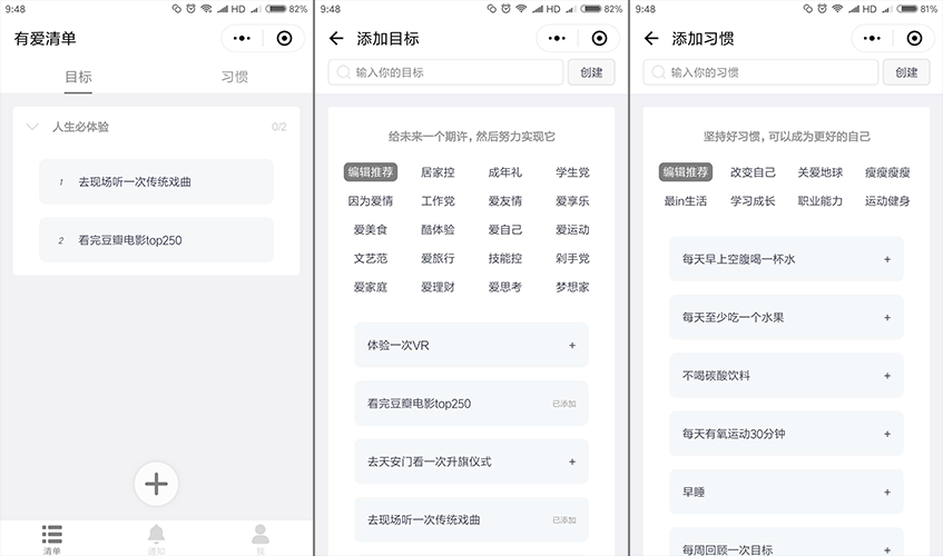操作步骤:进入有爱清单小程序,添加目标和习惯;可以给目标和习惯设置标签、快速打卡、记录每天动态、设置提醒、设置可见范围等。