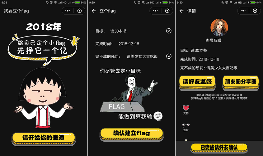 操作步骤:进入立flag小程序,请开始你的表演;设立目标、完成时间及惩罚,确立建立flag;邀请好友进行监督,好友可选择支持、监督或者diss你;目标完成后邀请好友进行确认即可。
