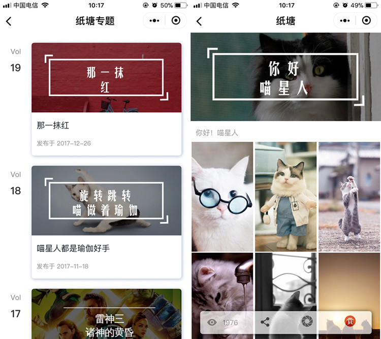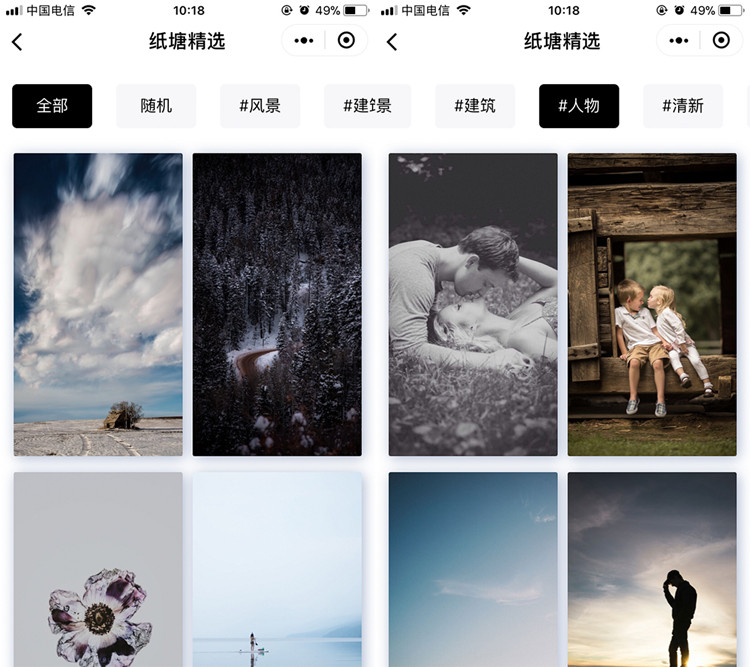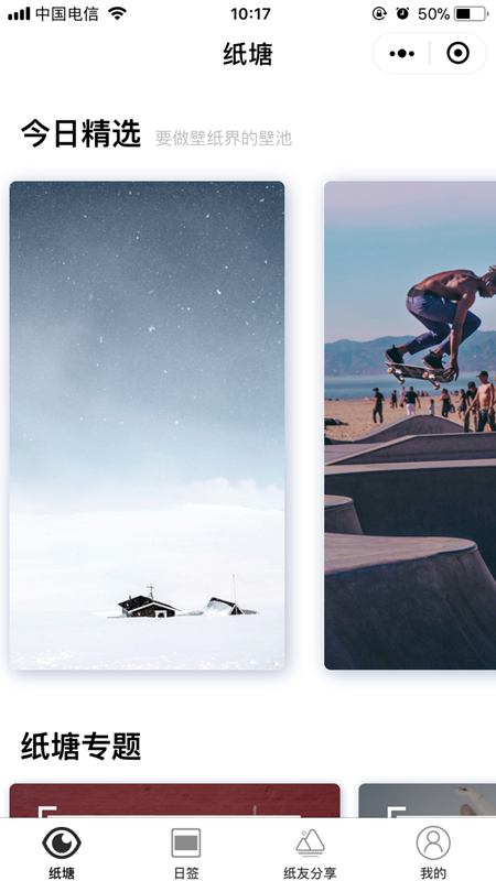 纸塘壁纸一共就有三个模块:今日精选、纸塘专题、还一个纸塘壁纸,从一点进小程序就可以看出来此款小程序非常简洁大气,深入人心。