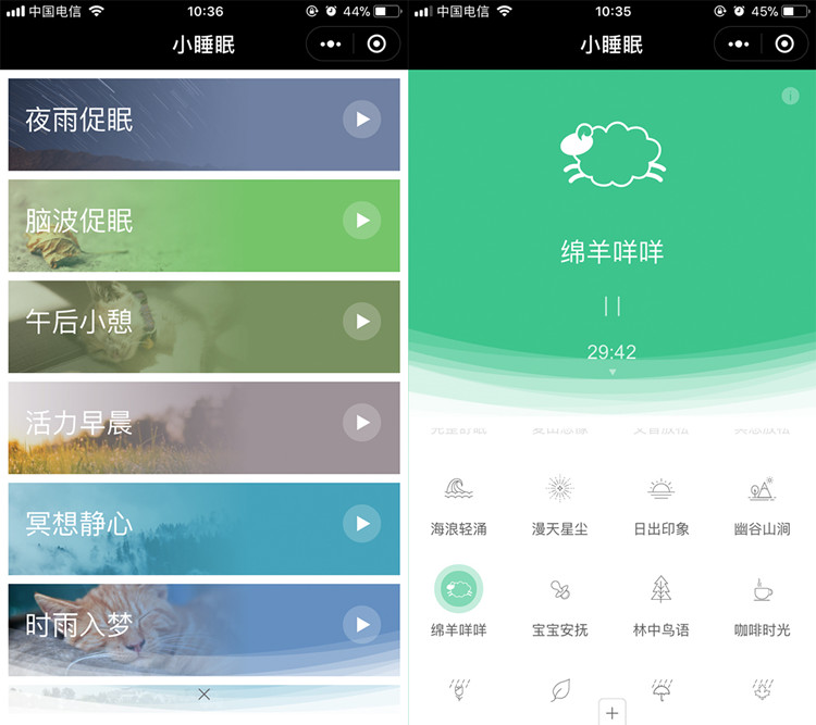 「小睡眠」从名字就能知道这是帮助用户提升睡眠质量的小程序,里面有不同场景下的音乐,每一首有半小时,可以让你在这半小时里,轻松入眠,告别失眠。